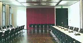 Die Farbkombinationen basieren einerseits auf dem historischen Bestand, andererseits bilden sie eine eigenständige, speziell auf die Nutzung abgestimmte Raumwirkung. Hier der Ausschußsitzungssaal in rot. Die weiteren Sitzungsräume sind unterschiedlich in den Farbstimmungen. |
