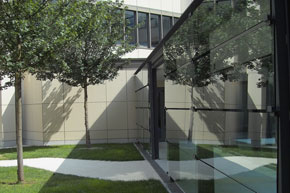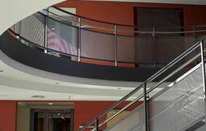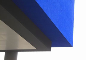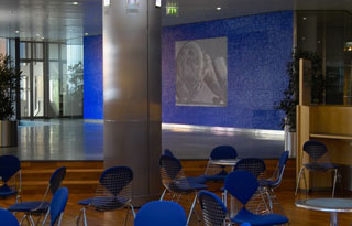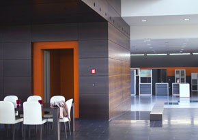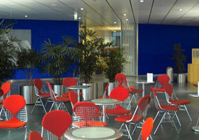 Deutliche Farbakzente im Zusammenwirken mit der Kunst-Achse. Diese Farbakzente werden begleitet durch helle, freundliche Farben, die über das Material wirken und einen Kontrapunkt zu der Stahl- und Glaswelt bilden. Hier in der Cafeteria wird ein interessanter, anregender Erlebnisbereich gebildet. |